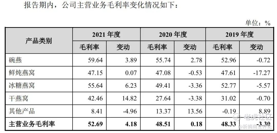 值得注意的是,燕之屋的燕窝产品毛利率其实很高,2019年-2021年的主营业务毛利率分别为48.33%、48.51%以及52.69%。其中碗燕产品的毛利率甚至高达60%。