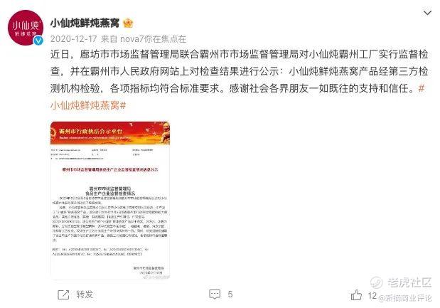 2020年7月,知名打假人士王海发文质疑小仙炖的“干燕窝含量5克及以上”、“0添加”以及“固形物含量大于等于90%”三大核心卖点存在虚假宣传的问题。