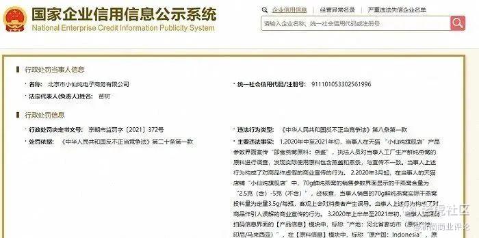 2021年5月,因存在使用原材料、生产产地与宣传不符、生产资质虚假等虚假宣传行为,北京市朝阳区市场监督管理局对小仙炖处以20万元罚款。