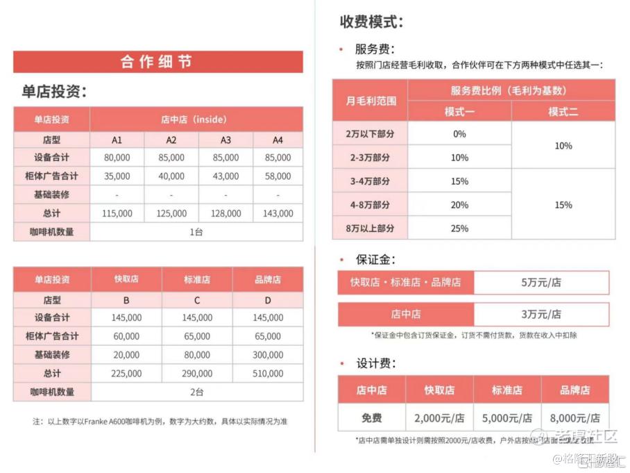 根据官网,库迪咖啡推出了“咖啡梦想家计划”,想要让天下没有难开的咖啡店。可以发现,它的门店分为:店中店、快取店、标准店、品牌店等,按照门店类型采取了不同的单店投资模式、收费模式。