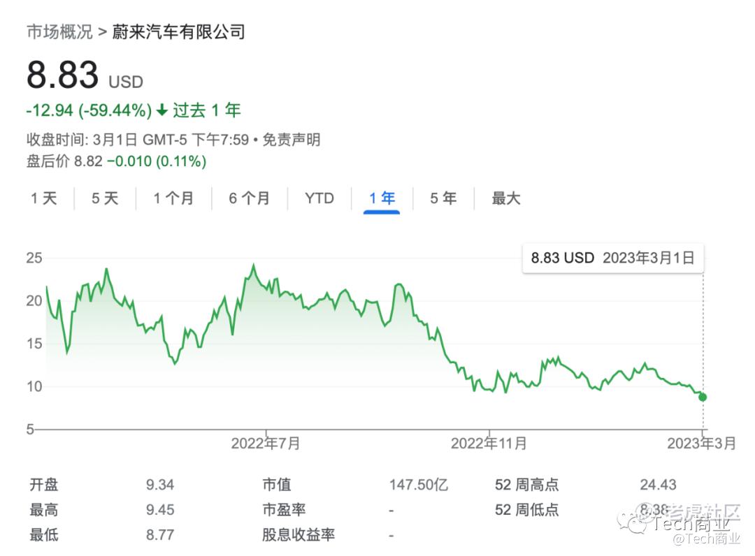截至本文,蔚来过去一年股价下跌59%,当前市值为148亿美元。