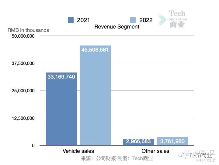 蔚来公司收入来自两分部业务,包括车辆销售、其他销售收入。其中车辆销售本财年收入为455亿元,同比上一财年同期的332亿元,本财年该项收入增幅为37%。其他销售收入为38亿元,同比2021财年时期的30亿元,表现为收入增长27%。