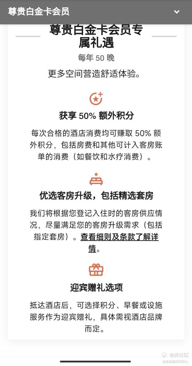 以万豪白金卡为例,在万豪累积入住50个房晚后,用户可以升级为白金卡,享有的权益大致包括:50%的额外积分,可能出现的房间升级,可延迟退房至下午4点,送早餐及行政酒廊,以及一些额外的年度礼遇。