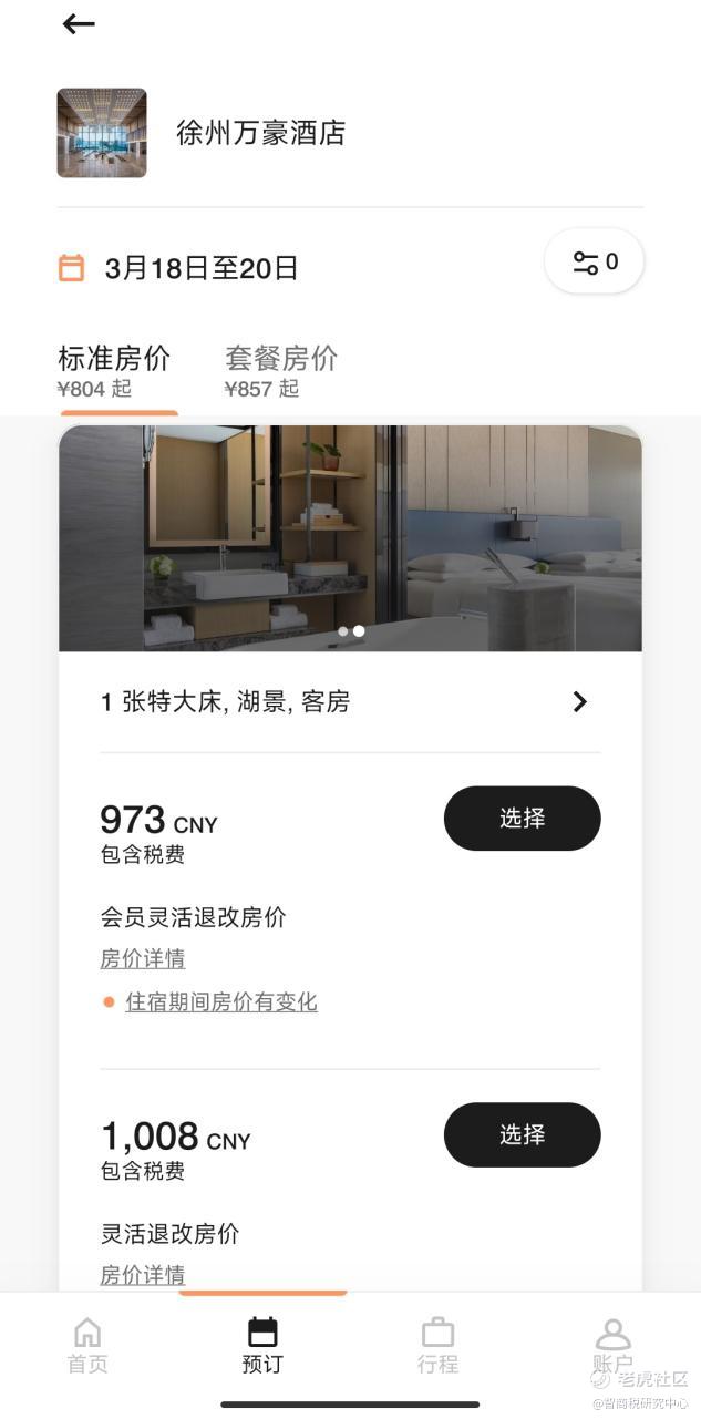 比如,潘哥在万豪官网,选择同样日期的徐洲万豪酒店,发现一晚大床湖景房,最低售价973元。如果在闲鱼上选择代订,湖景房一晚只要638元,比官网便宜了335元。