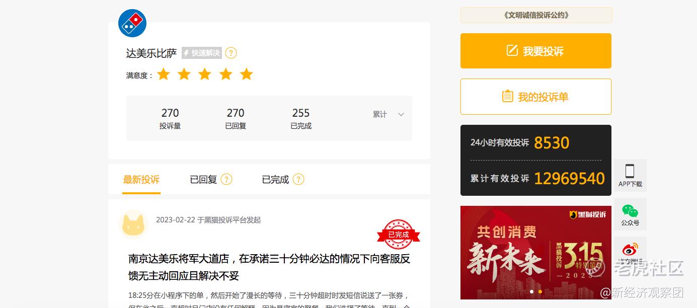 值得一提的是,在网上公开投诉平台中,有关达美乐披萨的投诉已达270项,其中除了食物品质问题外,竟然有较高比例投诉集中在三十分钟速达无法及时完成中。这意味着达美乐中国最具优势的产品卖点已经开始走入下坡路。