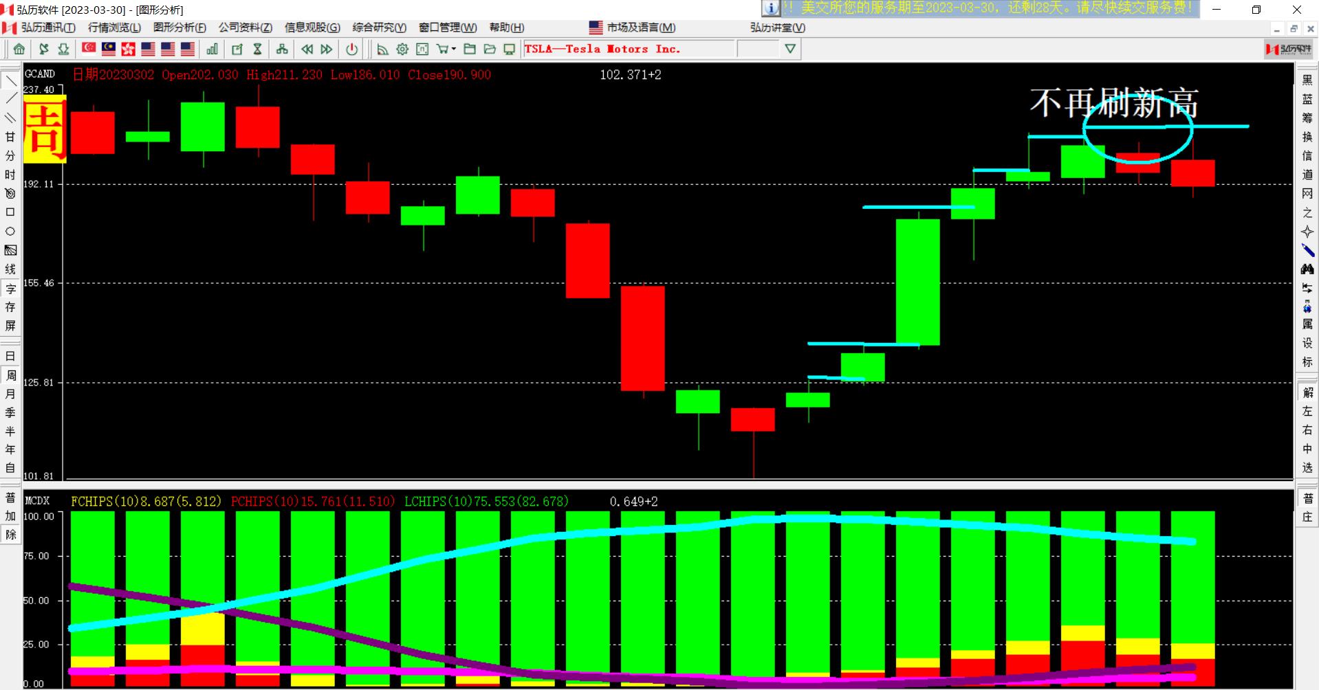 2、从周线角度来看,股价从1月13那周一直到2月13这周,每周都在刷新高,无论是收盘价还是最高价,但是到了上周股价已经没有再刷新高了,说明多方能量减弱,本周股价反而要刷新低了