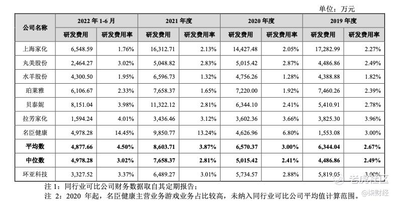 而与同行业可比公司(含上海家化、丸美股份、水羊股份、珀莱雅、贝泰妮、拉芳家化、名臣健康)对比,环亚科技各时期研发投入低于整体平均数。