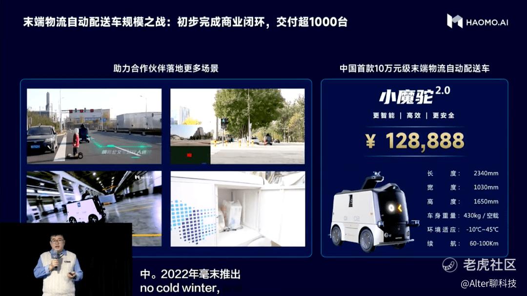 2022年4月的第五届HAOMO AI DAY上,张凯正式官宣了单车售价12.88万元的小魔驼2.0,面向商用市场的末端物流自动配送车产品首次进入到10万元级别。短短五个月的时间后,小魔驼2.0就开始下线交付,刷新了自动配送车辆的量产记录,并且在运营场景上覆盖了园区和城市开放道路。