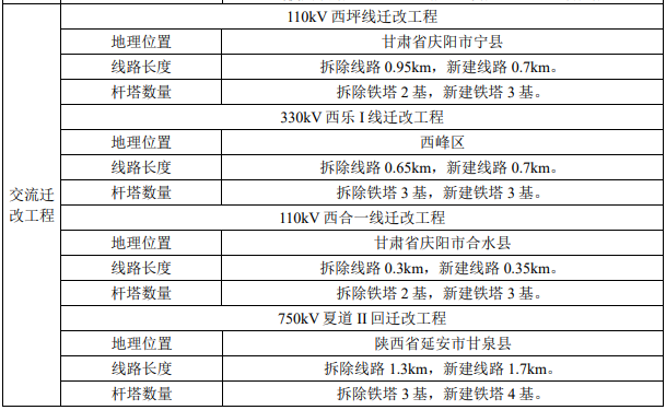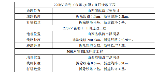 本项目涉及7条交流线路迁改工程,包括:①110kV西坪线:拆除长度约0.95km,新建约0.7km;②330kV西乐I线:拆除长度约0.65km,新建约0.7km;③110kV西合一线:拆除长度0.3km,新建0.35km;④750kV夏道II回:拆除长度约1.3km,新建约1.7km;⑤220kV乐荀(永乐~安泽)II回:拆除长度约1.0km,新建约2.2km;⑥220kV霍明I、II回:拆除段长度约2×0.6km,新建约2×0.9km;⑦500kV霍临I线:拆除长度约0.6km,新建约0.9km。