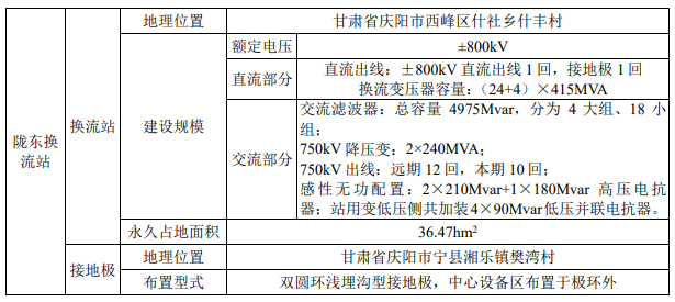 陇东换流站位于甘肃省庆阳市西峰区什社乡什丰村。换流变压器容量按(24+4)×415MVA考虑,额定换流容量8000MW,±800kV出线1回,接地极出线1回,750kV交流本期出线10回(远景出线12回),站外110kV电源线出线1回。
