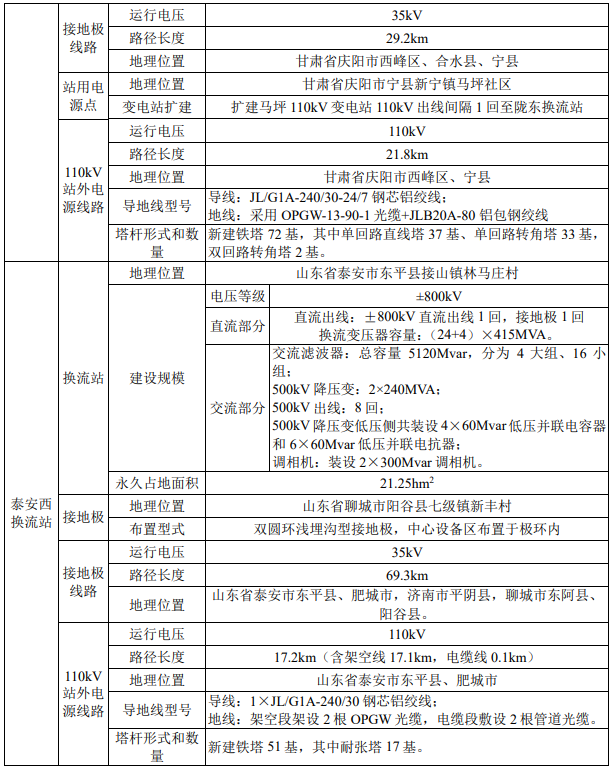 本项目主要建设内容包括:新建送端±800kV陇东换流站(以下简称“陇东换流站”,含配套送端接地极系统、110kV站外电源线路及对端马坪110kV变电站间隔扩建);新建受端±800kV泰安西换流站(以下简称“泰安西换流站”,含配套受端接地极系统及110kV站外电源线路);新建±800kV陇东-山东直流输电线路约933.9km;另涉及110kV、220kV、330kV、500kV、750kV交流线路迁改共7条,迁改路径新建长度合计约7.45km。