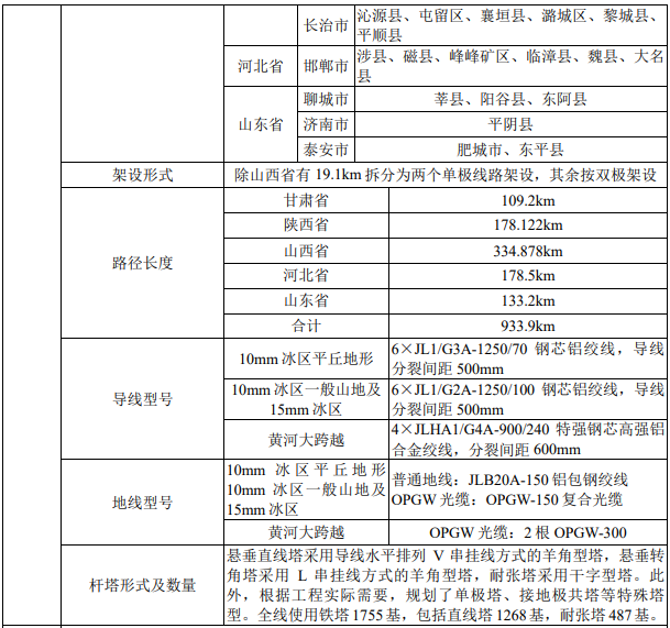 新建±800kV陇东-山东直流线路,路径全长约933.9km,途经甘肃(109.2km)、陕西(178.122km)、山西(334.878km)、河北(178.5km)、山东(133.2km)五省,除山西省有19.1km拆分为两个单极线路架设,其余按双极架设。
