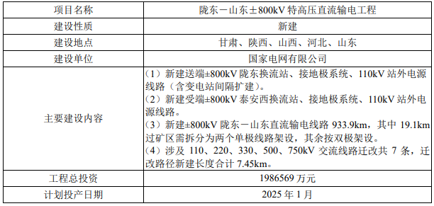 陇东-山东±800千伏特高压直流工程是国家“十四五”期间开工建设的重点能源项目,是山东省和甘肃省优势互补、互利共赢的重大战略工程,起自甘肃陇东能源基地,途经陕西、山西、河北,落点至山东泰安东平境内,线路总长度约952.2公里,年输电容量800万千瓦。