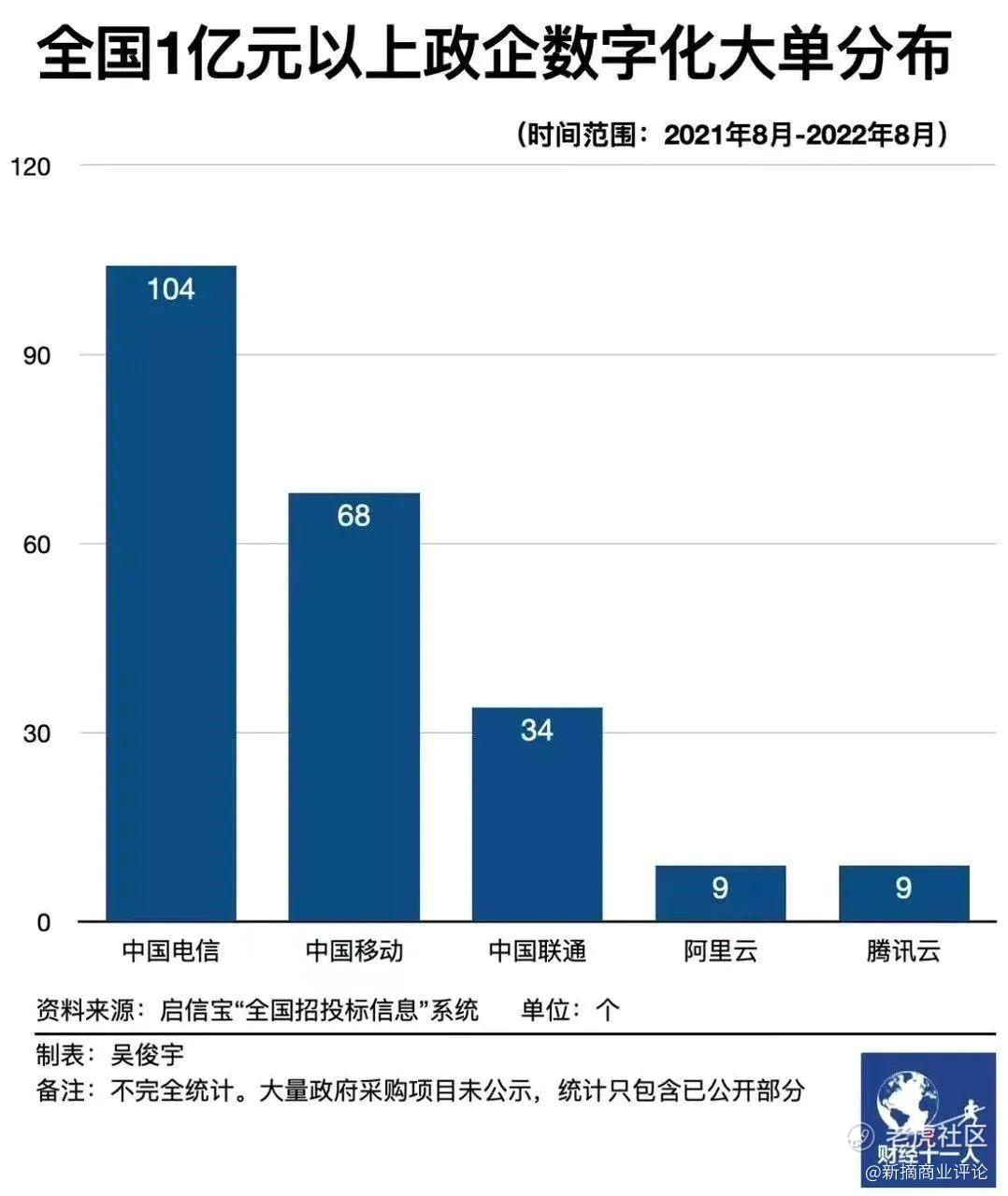 据财经杂志统计,中国电信近1年来获得的政企数字化大单就已有104个,阿里同期只有9个。