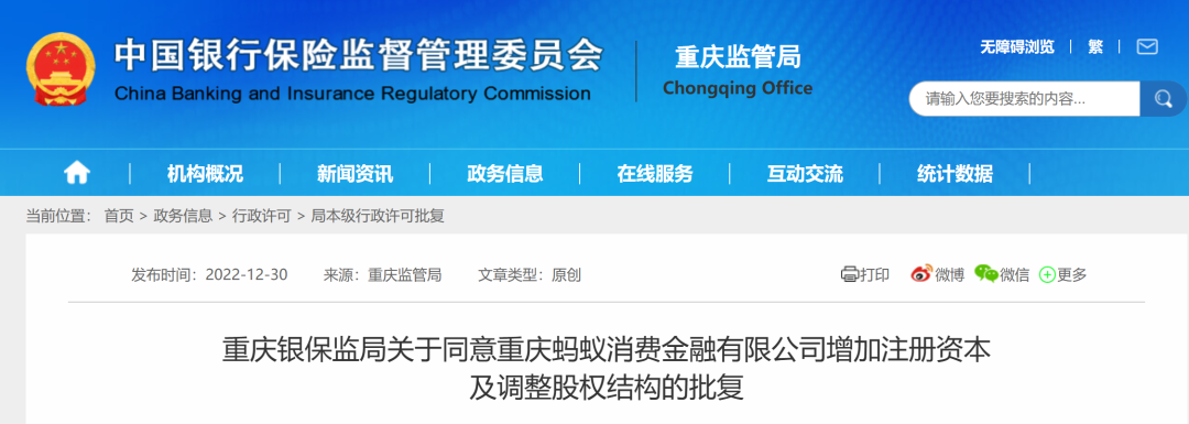 近日,重庆银保监局官网发布了《重庆银保监局关于同意重庆蚂蚁消费金融有限公司增加注册资本及调整股权结构的批复》。