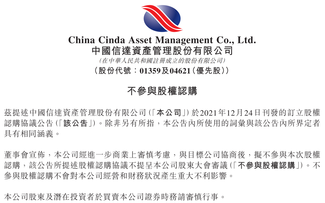 2022年1月,上述增资扩股方案生变,原本计划成为第二大股东的中国信达公告放弃认购。