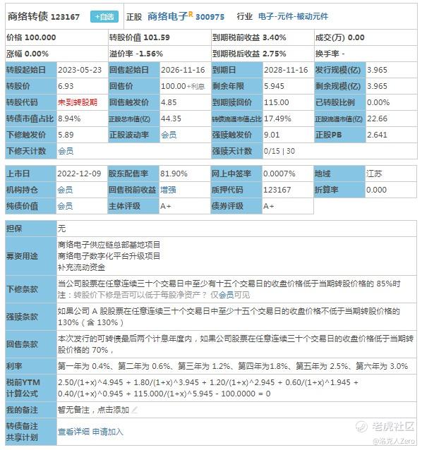 A股上市新债-商络转债,可转债代码:123167,转股价值101.59元,信用评级:A+,发行规模:3.965亿,税后收益2.75%。