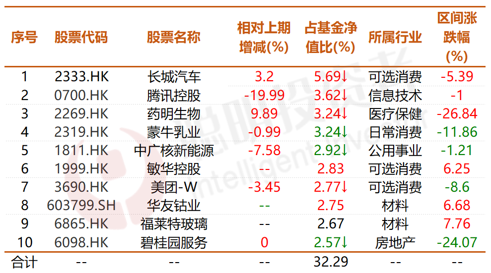 该基金的持仓集中度偏低,前十大占比仅32.29%,重仓股覆盖的行业较为分散,包含了汽车、互联网、医药、大消费、物业等多行业。