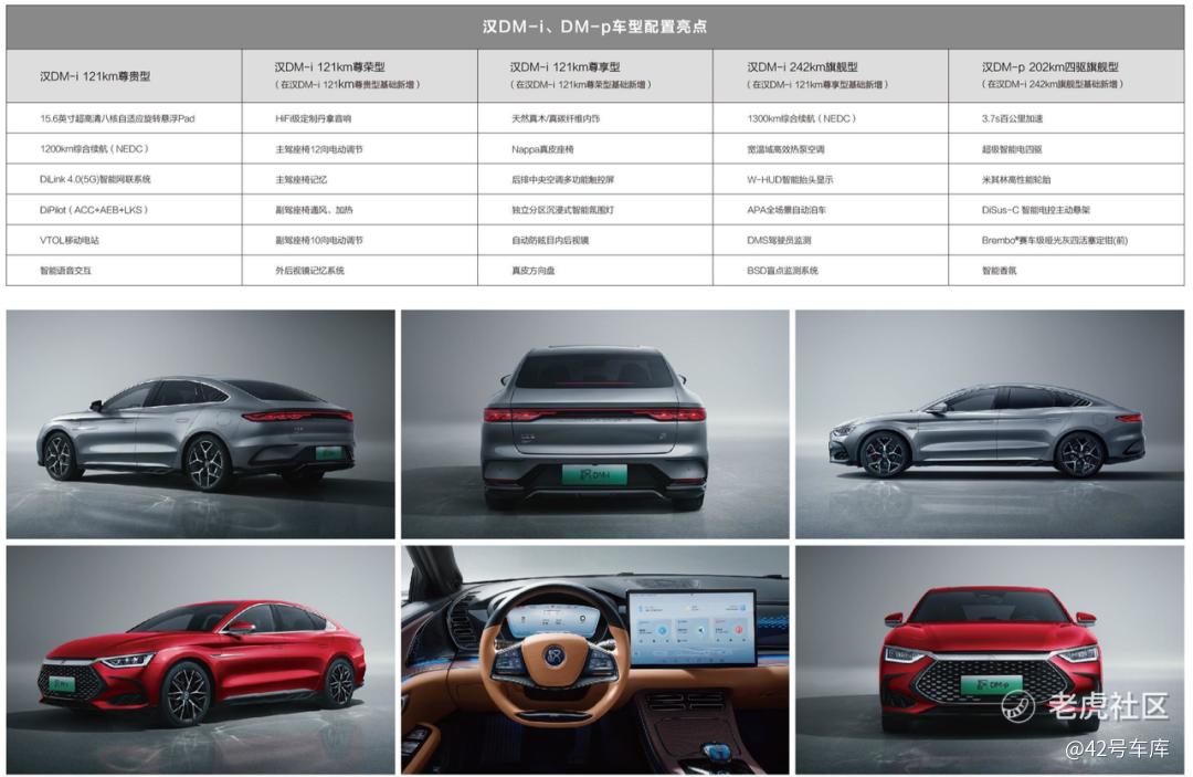 - 性能:汉 DM 的官方百公里加速为 4.7 秒,纯电续航里程为 81 km,汉 DM-p 的官方百公里加速和纯电续航里程大幅提升到了 3.7 秒和 202 km。亏电油耗方面,汉 DM 预估在 7—8 L/100 km,汉 DM-p 则为 5.2 L/100 km。
