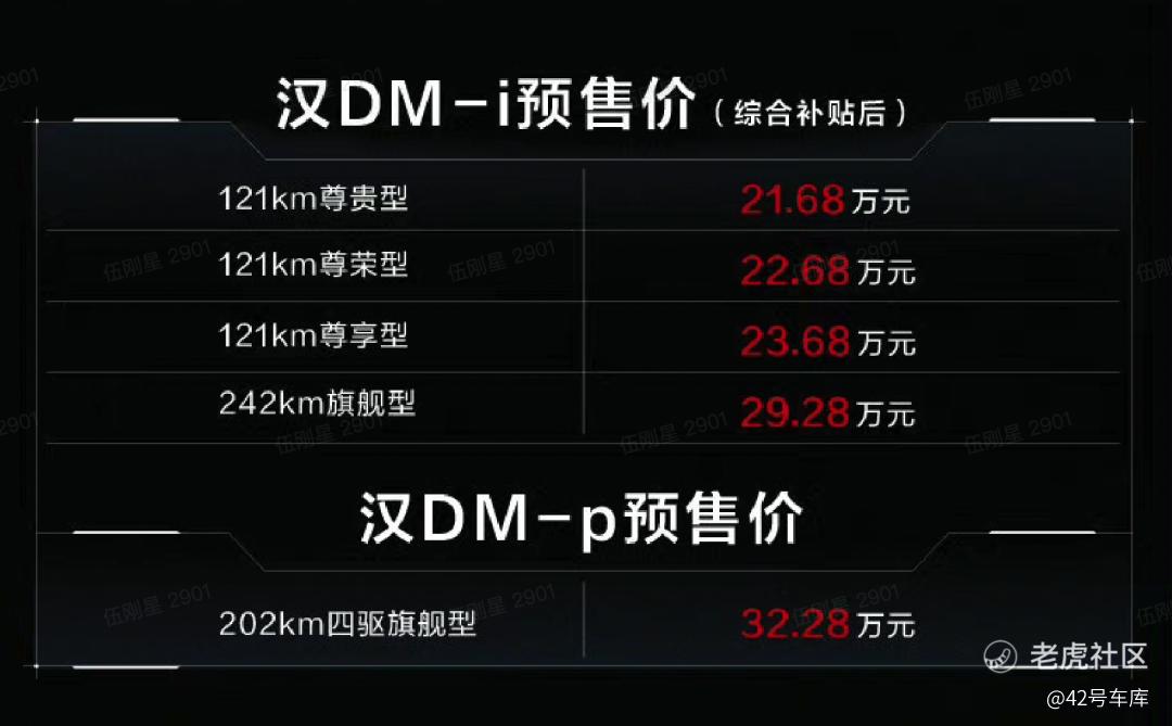 3 月 19 日比亚迪公布了汉 DM-i/p 的预售价,其中 DM-i 车型分为四个版本,补贴后预售价为 21.68—29.28 万元,DM-p 只有一个车型,预售价为 32.28 万元。