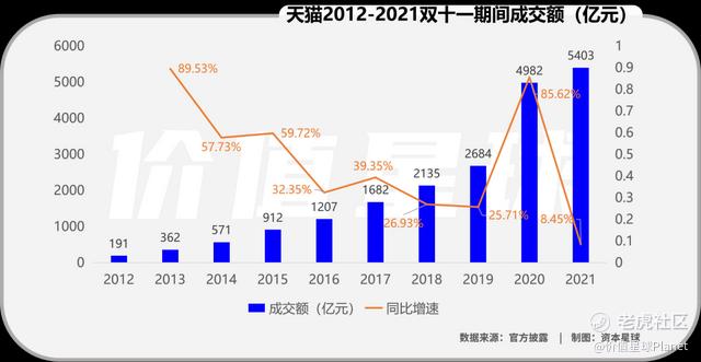 在阿里最盛大的双十一购物节期间,天猫销售总额达5403亿元,同比增长只有8.45%,翻看过去十年天猫的双十一销售收入增速,GMV增速没有一年低于25%。