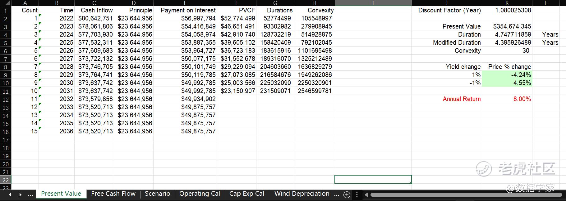 我曾工作的这个基金公司,专注于可持续能源,比如风能和太阳能。这家基金公司通过收购发电站,你没听错,直接收购发电站,来提供现金流,构成Bond Type债券类产品。久期(Duration)大概在5年,债券年限为15年左右,回报率(Yield)大概在7%,对债券来说蛮高的。