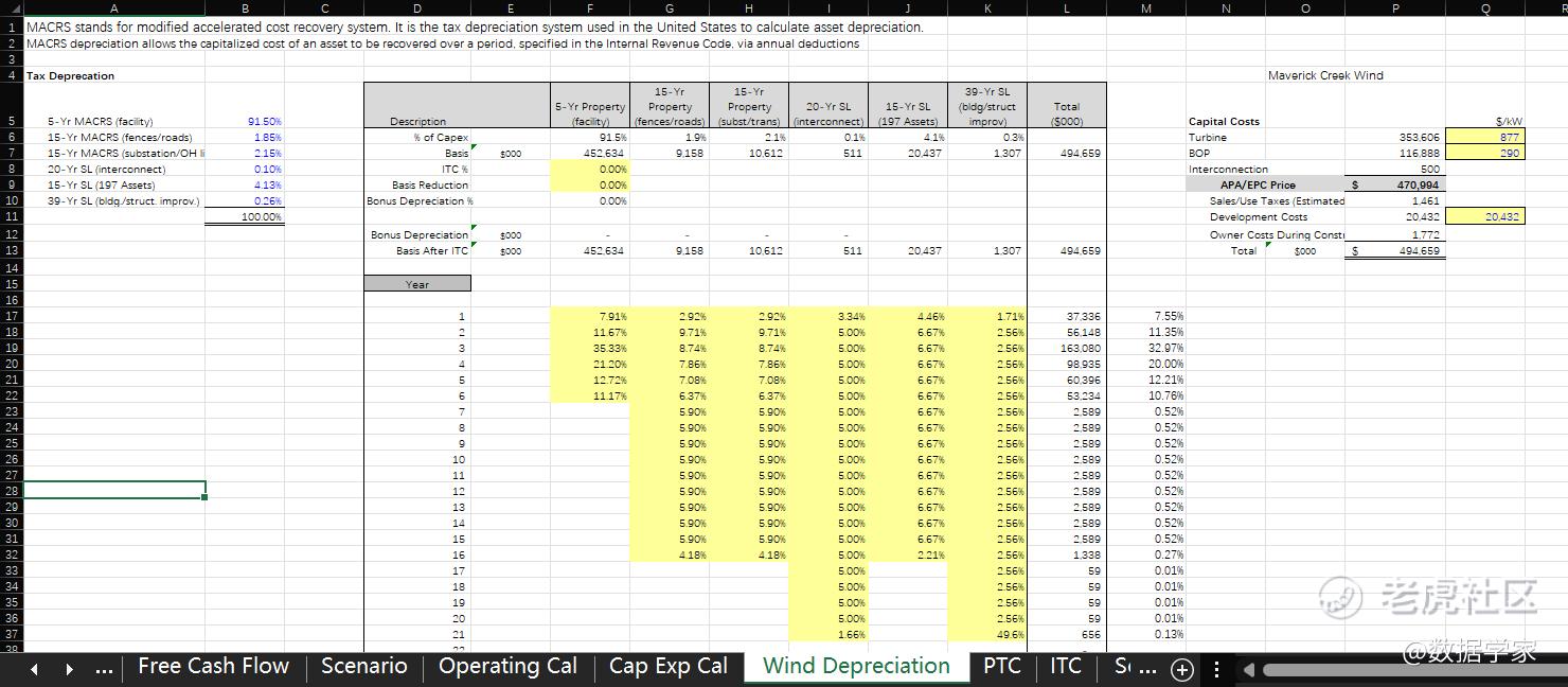 所以即使这家基金公司以高于会计价值40%(40% Premium)的价格收购发电站,它仍然能够产出7%的回报率。这个是个折现值,详情可参考下面的execl表格。这些运作了10年的电站基本上还能运作20年,而因为折旧,他们的会计价值/残值其实非常低;换而言之,他们相对便宜。会计折旧的细节我也附了一张表在下面。