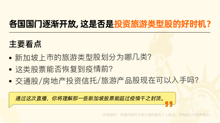 3月29日起,在新加坡的民众,位于户外时可选择不戴口罩,社交人数限制也由5人提高到10人。新冠疫苗接种也已经大规模地在全球展开,新冠死亡率受到控制,许多国家改变策略,决定与新冠共存。同时,这些国家也开始注重于恢复经济,打开国门便是举措之一,这对旅游类公司的营业额也有一定帮助。问题来了,这些公司能否回到疫情前的水平?现在是否是关注这些公司的好时机?我们将在这直播具体分析,主要深入了解:
