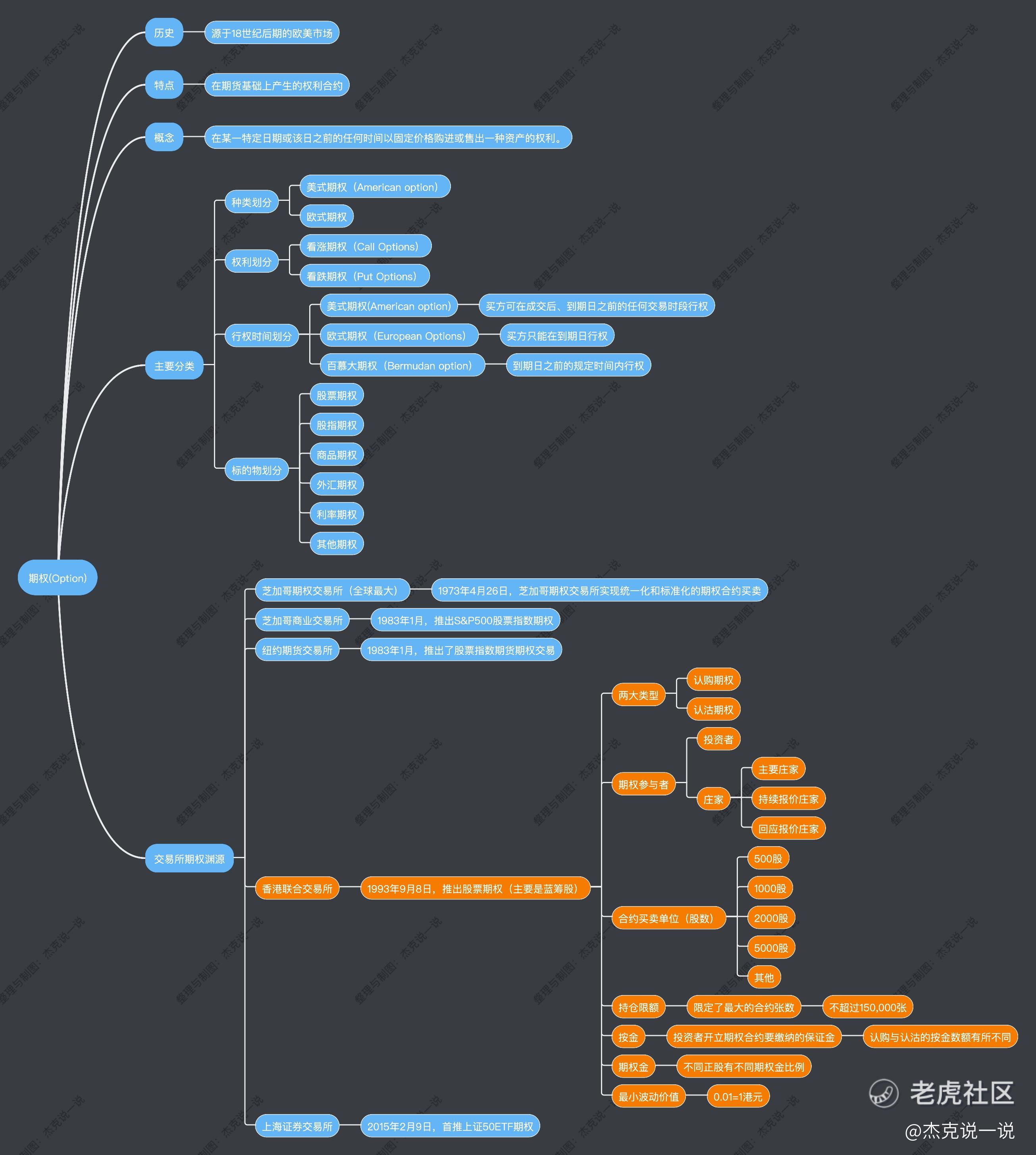 在本文之中,杰克将从期权的历史、特点、概念、主要分类和交易所渊源五大方面来讲解期权的基础知识,并特别讲解港股的股票期权,小伙伴们可以结合配图的思维导图来快速理解。