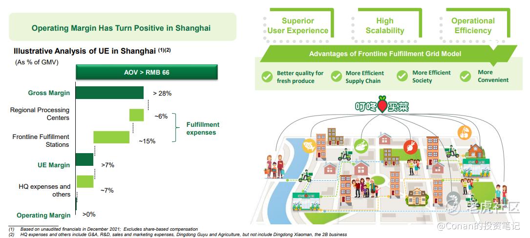 一般1Q是城市杂货市场淡季,Q1收入会相对较低。公司在业绩会上预计在2022年1Q公司净亏损会继续小幅收窄,经营现金流会出现比较大改善,而2021年12月,叮咚买菜上海地区已经实现盈利。按财报数据,叮咚买菜在上海地区毛利率为28%,客单是66元左右。公司在业绩会上预计在2022年2Q左右,长三角地区很可能也会实现盈利