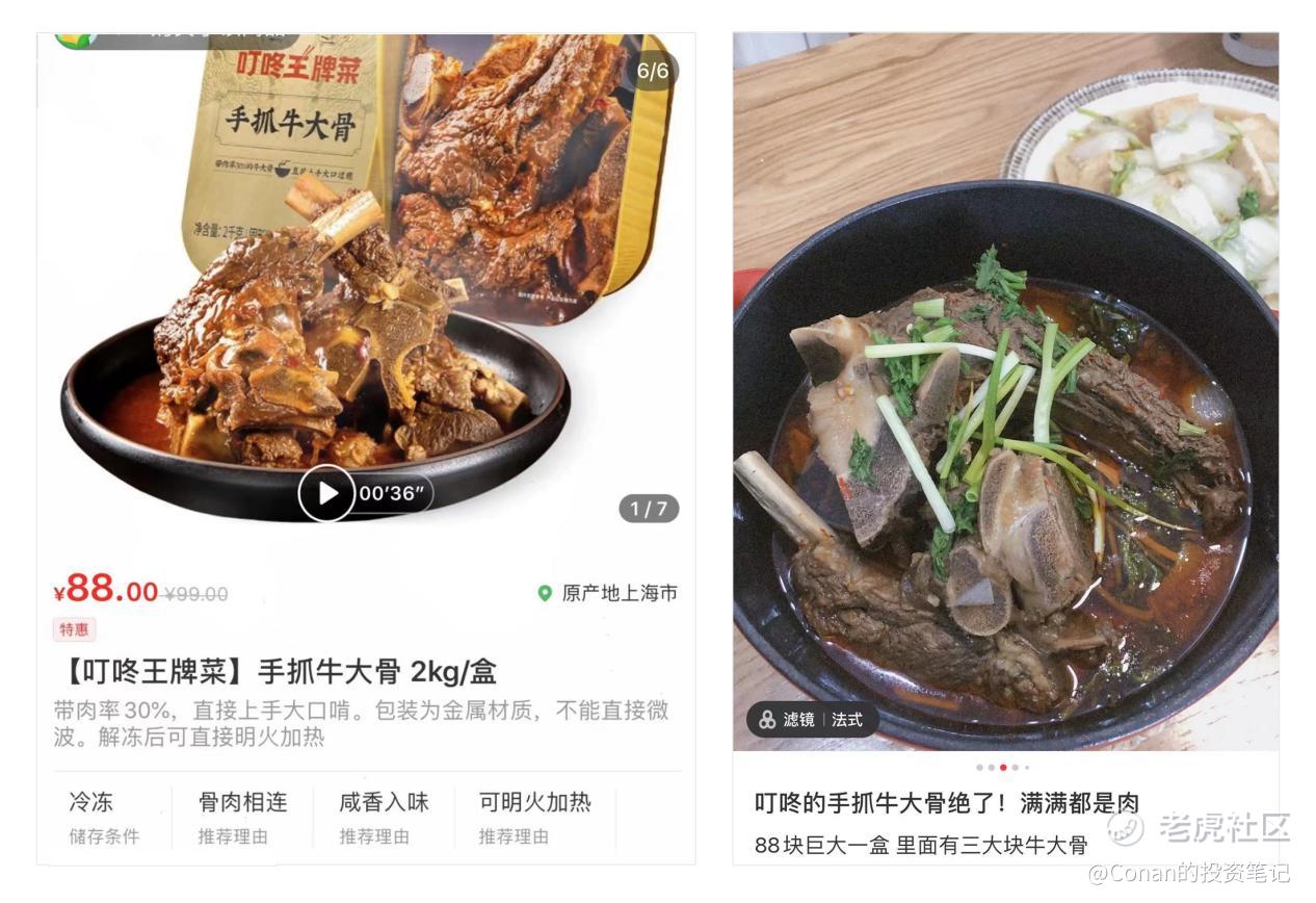 叮当王牌菜中的手抓牛大骨的产品页面和实物图