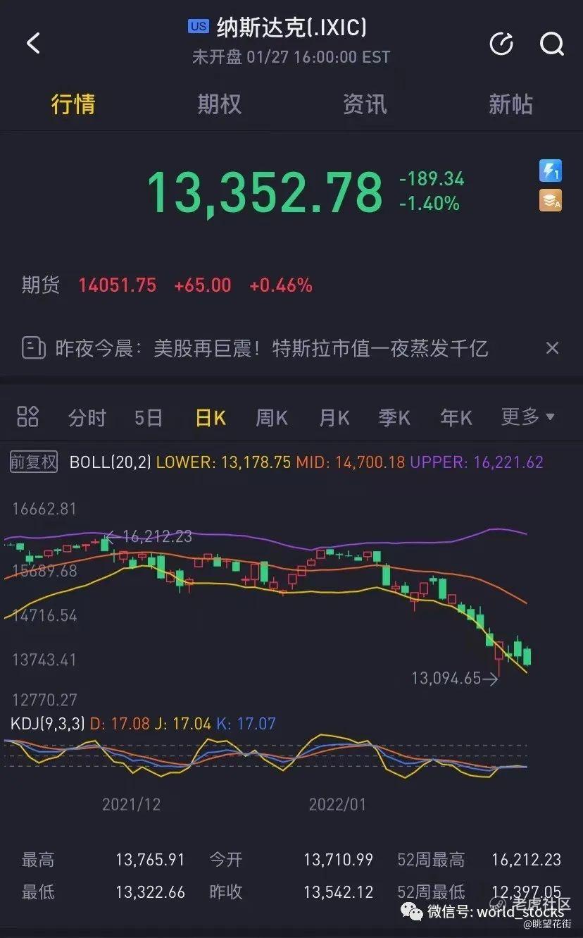 纳指叕是高开低走,高位最高涨幅1.63%后,开始转向收跌-189.34,跌幅-1.4%,真是令多头们苦不堪言,日线各项指标显示也不容乐观,kdj金叉的良好局面遭破坏,rsi6、20日线11.80、20.72继续处于超卖区域,没一点波澜。13500点的支撑线被突破,下个支撑预计是13300点附近 。周线蜡烛图,依然是下方十字星,kdj处于超卖区域。1月最后一个交易日怎么看?希望不要再跌了,把支撑筑牢一点。但指数从来不以股民的意志为转移,不知道会不会以华尔街意志为转移。如果再跌一波,只能持续观望了,没有有利的指标出现,暂不出手更加稳健吧。$纳指ETF(QQQ)$
