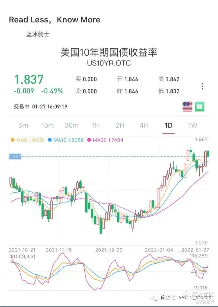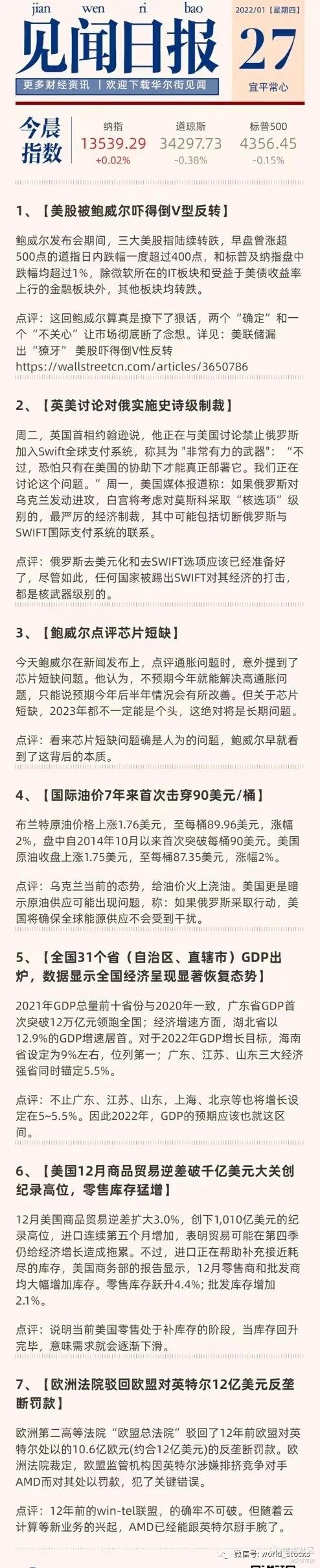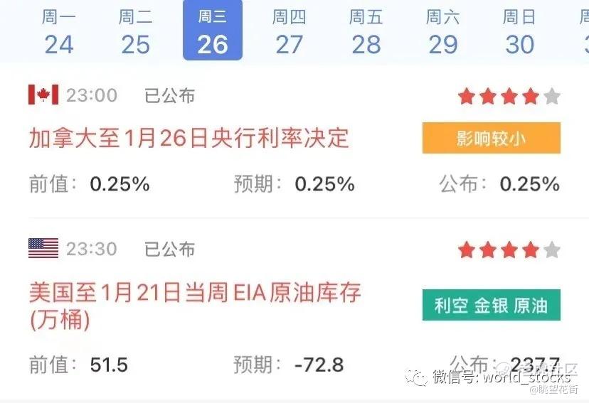 1月26日,纳指高开低走,一度涨幅3.36%,然后高空跳水,最大跌幅-0.97%,最终收涨+2.82点,涨幅+0.02%,收于13542.12。当日上穿ema5日线失败,RSI6、12日线依然处于超卖区域。好的方面是kdj指标出现的看多蜘蛛金叉形态尚未破坏,这是一个积极的信号。再看一下周线,蜡烛图目前显示的是十字星形态,比较偏向于启明星。当月还剩最后2个交易日,指数走势尤为关键。欢迎关注公众号:眺望花街