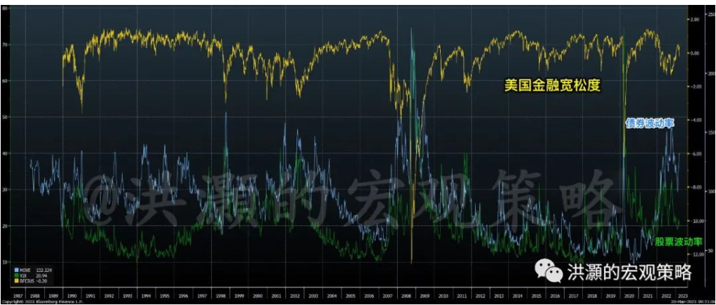 亚洲开盘后,美国股指期货和日经开始松口气反弹,美元走软,黄金、比特币走强。市场现在暂时认为瑞信的AT1债券减记是单一事件,不会蔓延到其它银行。但是可以想象,其它银行的AT1债券价格将很可能下跌,并有可能危及到其它银行的资本充足条件。交易数据显示,美国市场的金融条件并未收紧,而美国债券市场的隐含波动率与美股隐含波动率分道扬镳,债券居然比股票还危险(如图)。1933年3月5日,为了遏制长达一个月的银行挤提,罗斯福总统宣布银行休假四天,并在3月9日继续延长休假到周末,并在国家电台上举行“围炉夜话”,告诉全美国人民他们“存款在银行里比在床垫下藏着更安全”。3月12日,美国人开始排队把钱存回银行系统,结束了美国历史上最长的银行挤提事件。