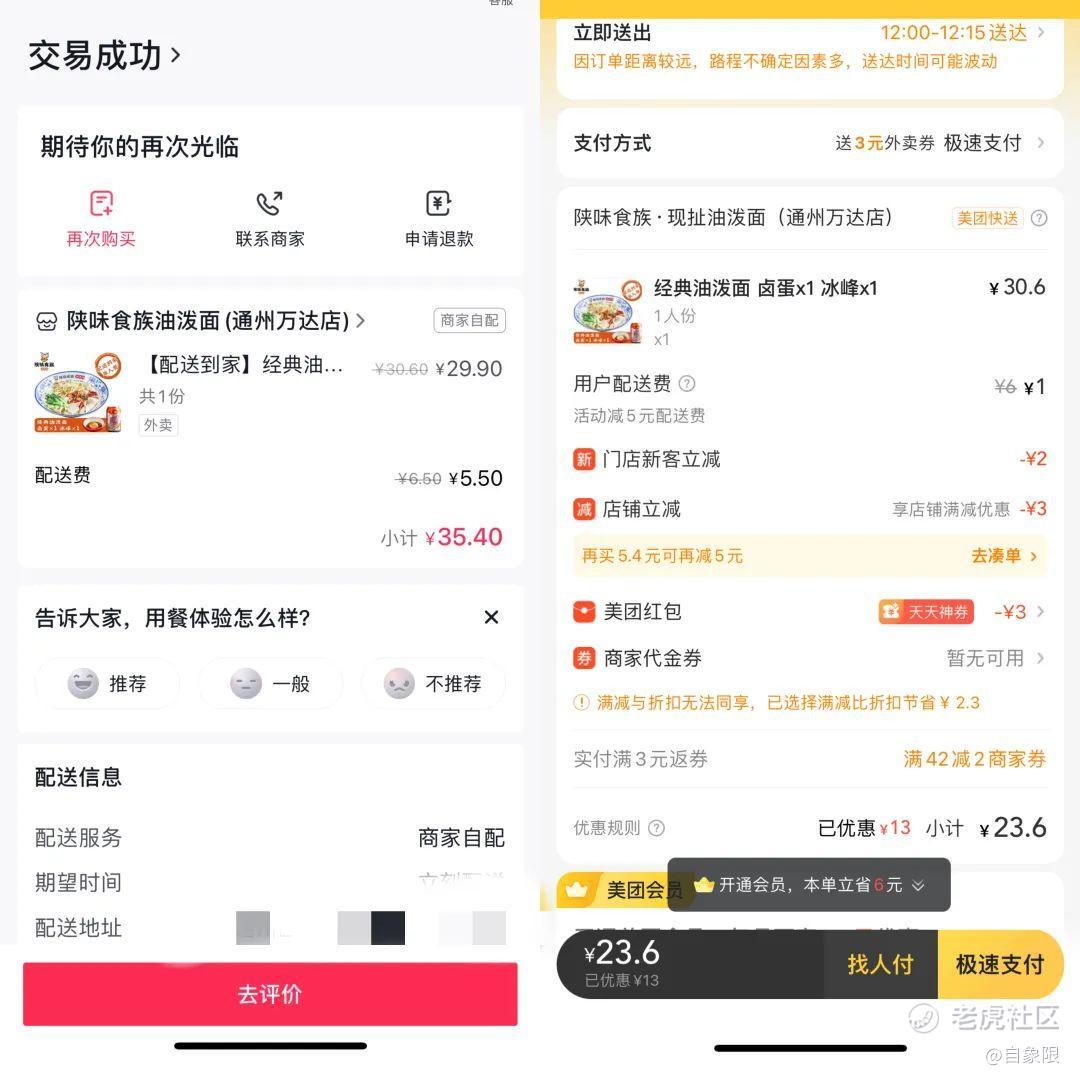 以「自象限」在抖音上下单为例,同一商家的同一套餐价格相同,配送费也均为5元左右,但美团有各类补贴:配送费减5元、新客红包立减2元、天天神券立减3元,杂七杂八算下来,比抖音便宜12元左右。