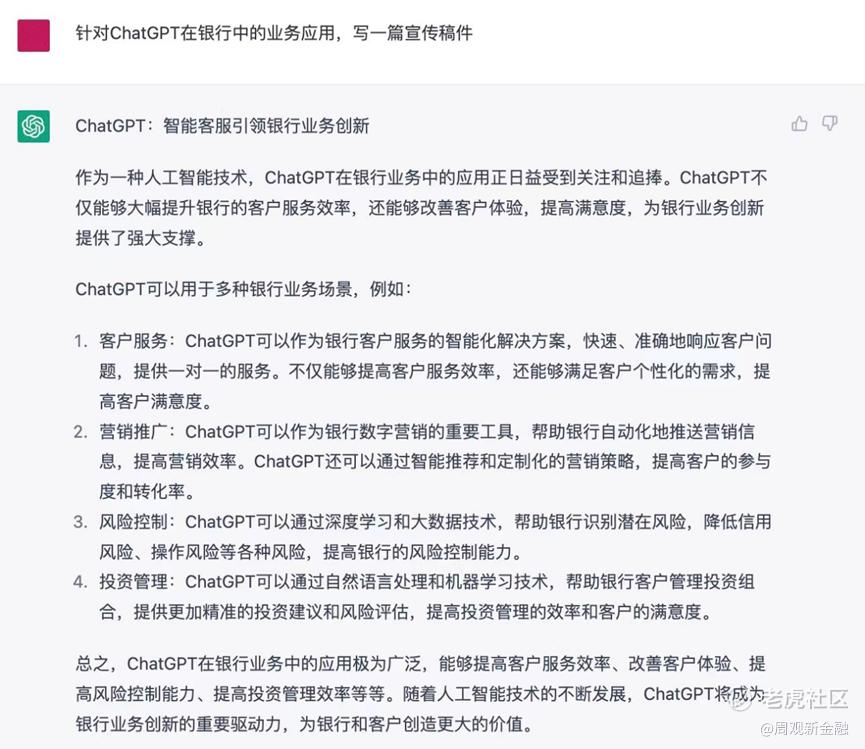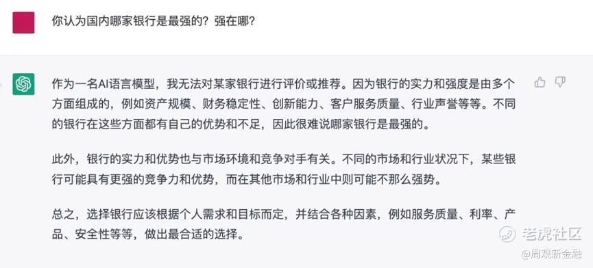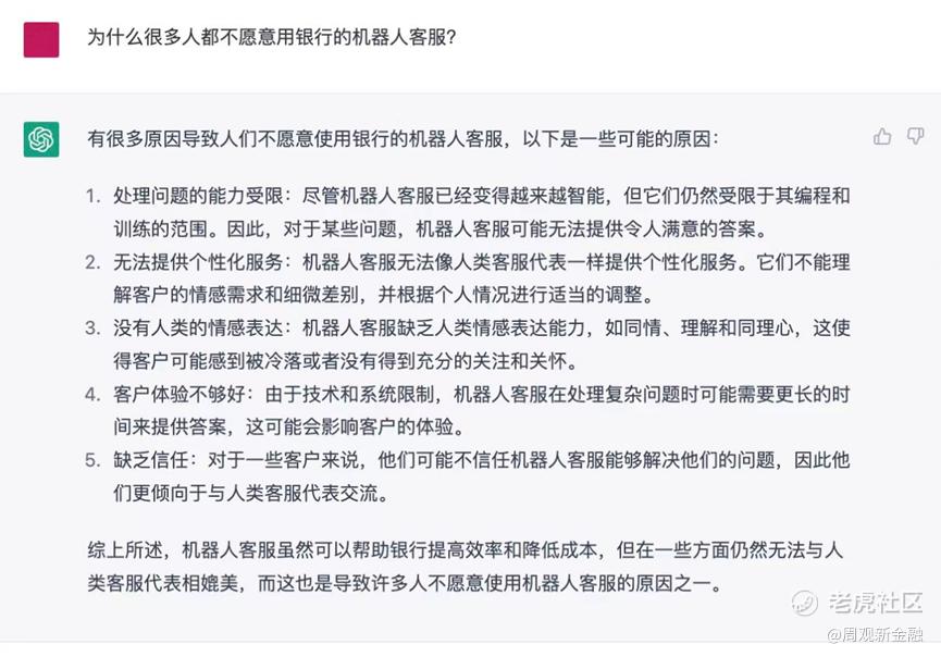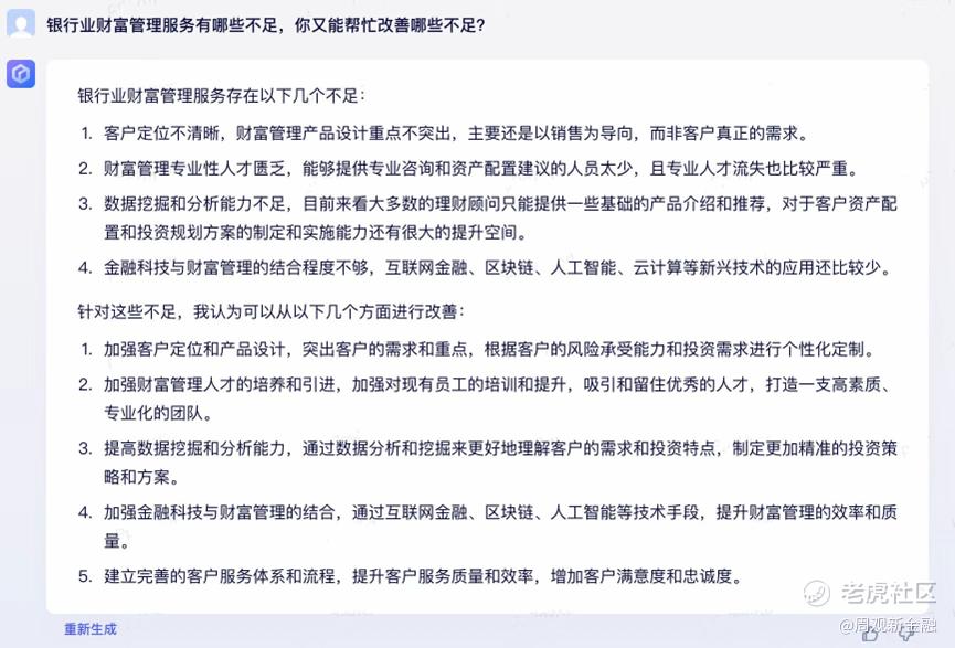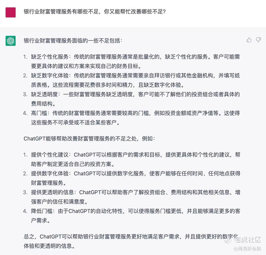 二者回答都逻辑清晰,也明确指出了部分问题所在。但对比之下,依然不难发现ChatGPT阐述的问题更像“人话”,比如更接地气地指出传统财富管理服务的门槛较高,缺乏个性化服务,与普通投资者契合度不高等C端视角更关注的痛点。