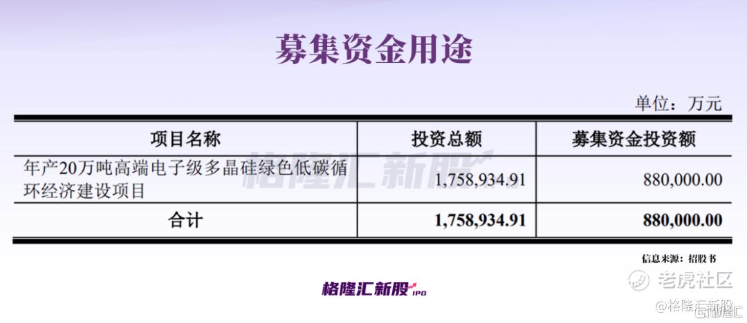 本次冲刺A股,公司拟募资88亿元,用于投资年产20万吨高端电子级多晶硅绿色低碳循环经济建设项目。