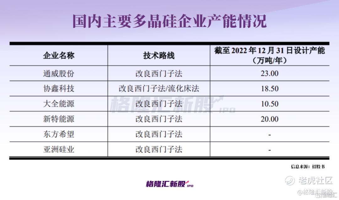 市场竞争格局方面,据招股书,2021年国内年产能在5万吨以上的企业仅有5家,包括通威股份、协鑫科技、大全能源、新特能源、东方希望,产能共计44.1万吨,占国内多晶硅产能的85.0%,行业集中度较高。