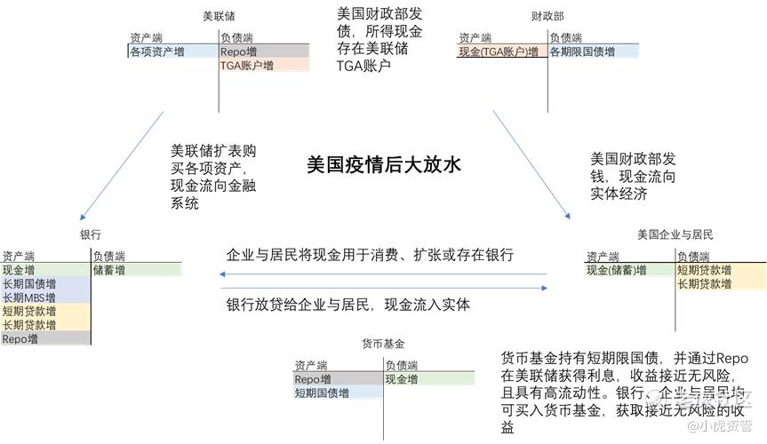 在美国疫情后大放水时期,美联储、美国财政部、银行、货币基金和美国企业与居民的资产负债表都在显著扩张。实体经济中的美国企业与居民,以及金融系统中的银行和货币基金,都需要处理庞大得前所未有的资产,一如下图。