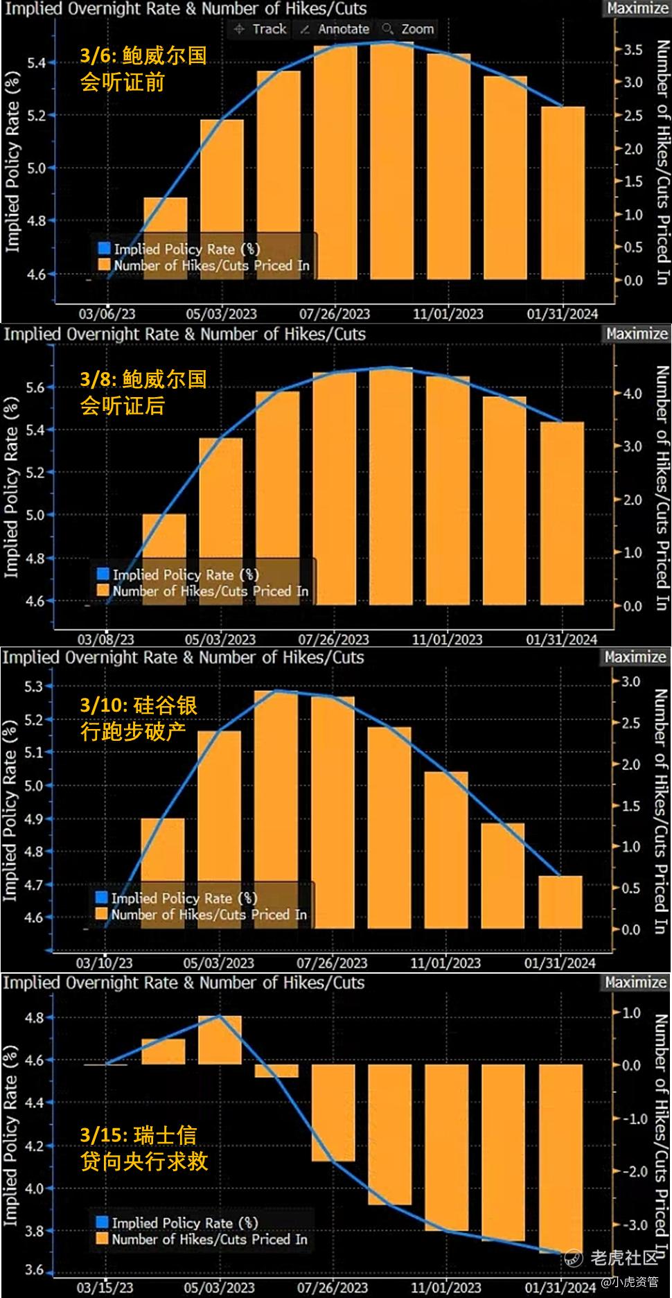 $硅谷银行(SIVB)$ 跑步破产,欧美银行板块地动山摇,牵扯着近期市场叙事发生了巨大的变化。一如下图所示,美联储加息峰值的预期,先从5.5%上升到近5.7%,下滑到了截至3月15日收盘的4.8%左右,意味着本轮加息周期最多还剩最后一次加息;而明年1月美国基准利率水平的预期,也经历了同样的先上后下的历程,截至3月15日收盘已被美联储利率期货交易员定价为,相比加息峰值会降息4次!
