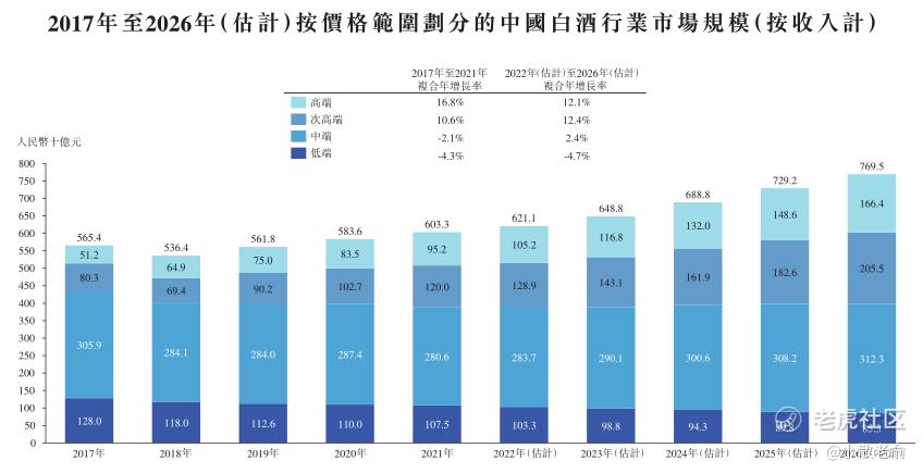 随着消费者购买力提升及白酒品牌高端化,预期中国白酒消费将转向次高端及高端的白酒产品,而次高端及高端白酒产品的市场规模预期将于2026年达到人民币3,719亿元,2022年至2026年复合年增长率为12.3%,为所有价格范围的白酒产品中的最高值。次高端及高端的白酒产品的市场份额预期将于2026年达到48.3%,较2021年增长12.6%。