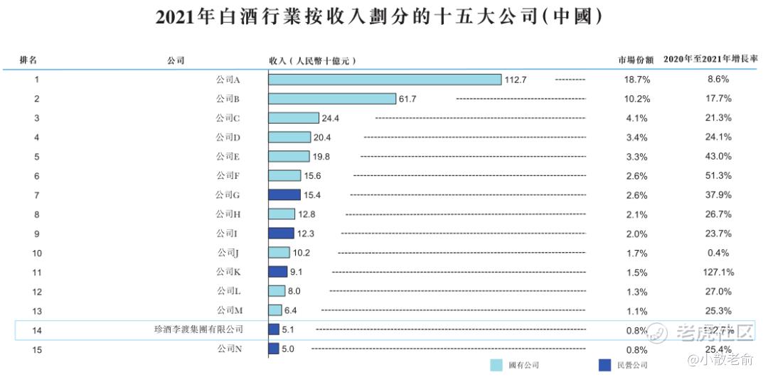 公司是一家致力提供以酱香型为主的次高端白酒产品的中国白酒公司。根据弗若斯特沙利文的资料,按2021年收入计,公司在中国所有白酒公司中排名第14位,市场份额为0.8%。于往绩记录期,公司以远超于行业平均水平的速度增长。增长得益于酱香型白酒在中国的日益流行以及消费者对高端化的喜爱,公司预期将继续受益于该等市场趋势。在中国,公司经营四个主要的白酒品牌,包括旗舰品牌 珍酒 、蓬勃发展的品牌李渡 ,以及两个地区领先品牌 湘窖 及 开口笑 在内的四大白酒品牌。