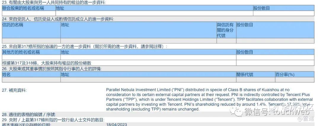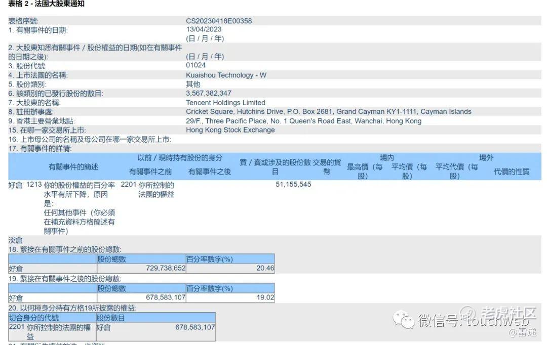 据港交所文件显示,2023年4月13日,腾讯派发快手51,155,545股。