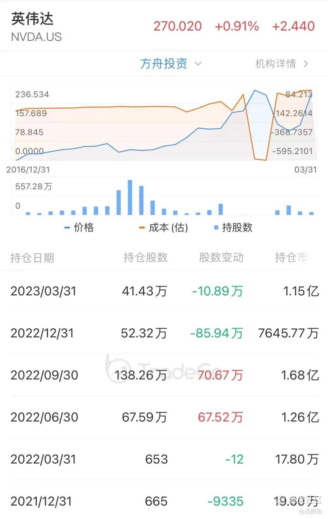 方舟投资(ARK)于4月17日向美国证监会(SEC)提交13F文件,披露了其2023年Q1持仓数据。