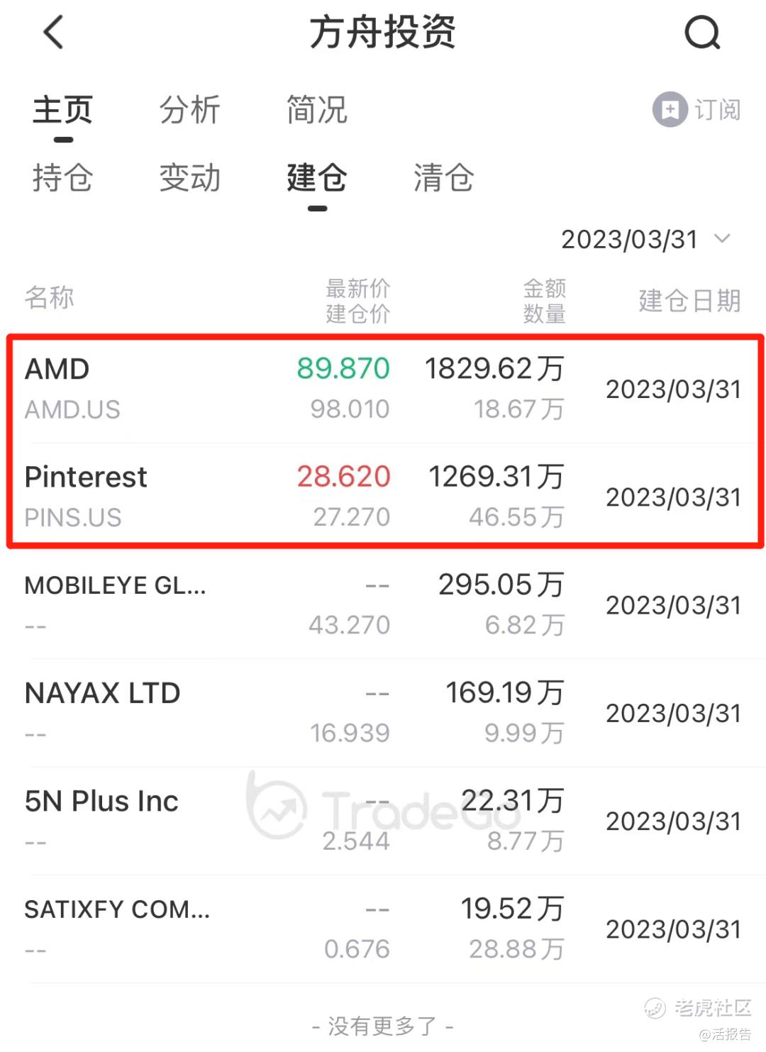 除上述个股外,ARK在一季度还建仓了半导体巨头超威电脑(AMD.US)及“图片版Twitter”Pinterest(PINS.US),金额分别约为1830万美元及1270万美元。