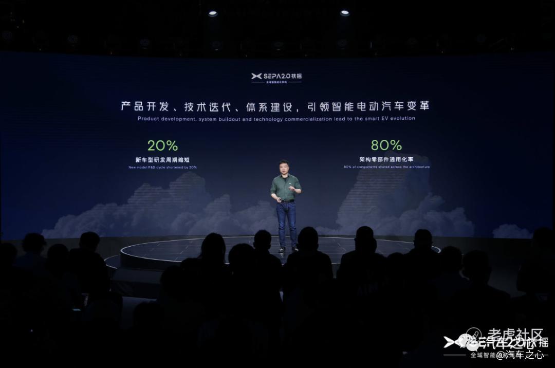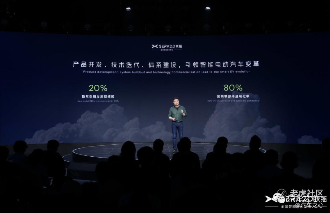 按照小鹏的说法,采用 SEPA 2.0 扶摇架构开发,将带来两个好处,一是新车型研发周期将缩短 20%;二是基于架构部分的零部件通用化率最高可达 80%。