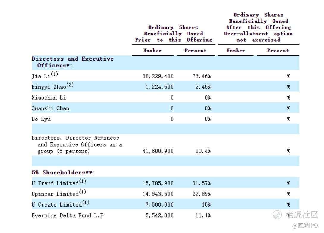 IPO前,创始人李佳通过U Trend持股31.57%、通过Upincar持股29.89%、通过U Create持股15.00%,合计持股76.46%;Everpine Delta Fund L.P,持股11.10%。