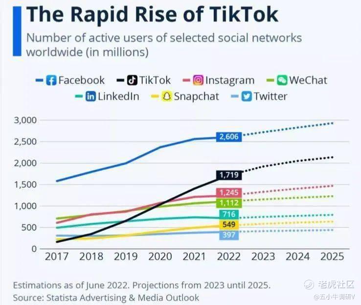 ▲从全球角度看,字节抖音+TikTok用户量仅次Facebook。