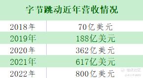 据科技媒体The Information援引知情人士的说法称,2022年,字节跳动营收超800亿美元(约5514亿元),较2021年的600亿美元涨超30%以上。