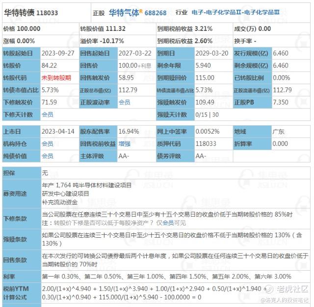 A股上市新债-华特转债,可转债代码:118033,转股价111.32元,信用评级:AA-,发行规模:6.46亿,税后收益2.60%。